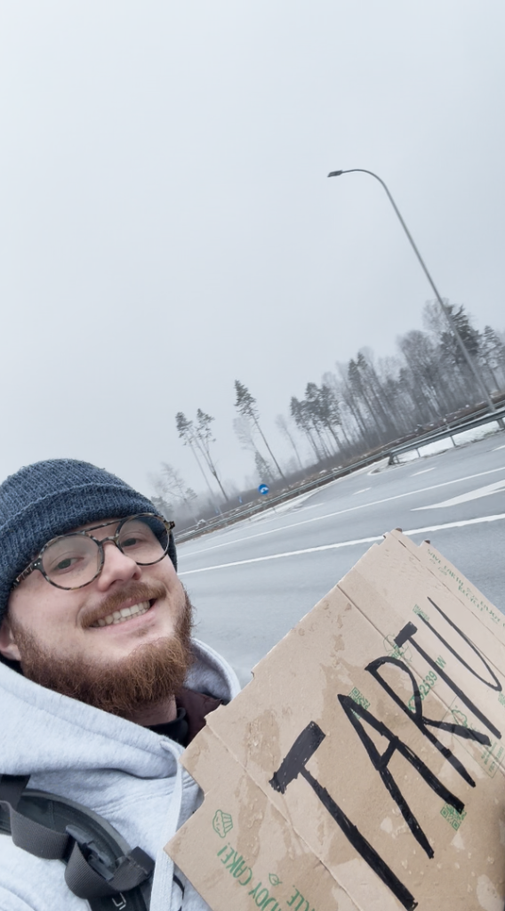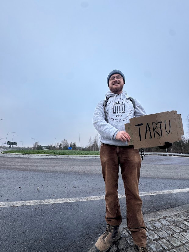 I felt more confident on the road with one international ride under my belt. So far, it was working! Being one country closer to Estonia, I set my sights more precisely on landing a trip to Tartu. I flipped my cardboard sign around to where I had scrawled “Tartu”, and strategically changed into my recognisable University of Tartu hoodie (available at the University of Tartu Gift Shop). Unbothered by the number of vehicles with LV tags, I stood waiting for the next car-of-fortune to come my way.