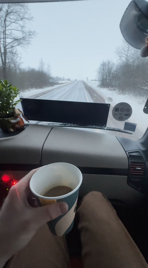 Seemingly pleased to have a guest with him, my new friend was happy to tell me all about his life as a truck driver living in Latvia. As we sailed through the Baltic countryside, the two of us spoke about our journeys, what fate had brought the two of us from our far-flung homelands to this stretch of northbound road. Along the way, Ali ensured that I would not go under-caffeinated or hungry. I was offered my choice of tea or coffee, fresh dates from his in-cab refrigerator, cookies, and even a cigarette. I expressed my pleasant surprise at his hospitality, to which he shrugged and said through easy laughter, “I am Turkish!”
