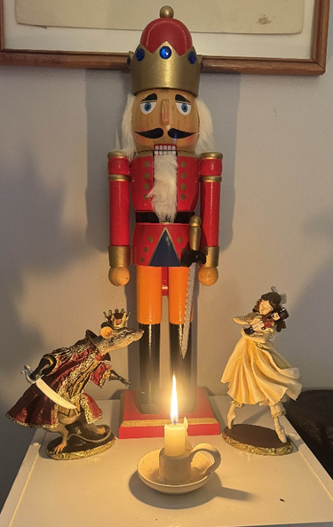 My annual Christmas Nutcracker display, featuring the Nutcracker Prince, the Mouse King, and Marie.